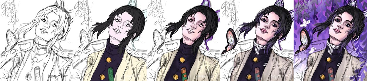 Now, the part I disliked the most -- the background. Maaaan, can't backgrounds be easier for once? I ended up adapting the same background many other Shinobu fan arts do (theirs look more natural, though!).