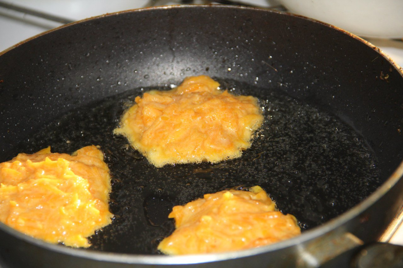 4. Heat the pan vegetable oil, with a tablespoon of the formed thin pancakes, put them on a heated pan and fry each side for about 2-3 minutes.