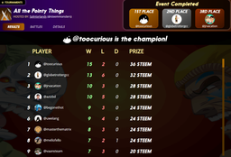vcdragon(25)•in #splinterlands•2376 days agoTournament Result top 9 ALL The Pointy Things 13-7-2019Event Info : Gold League All Cards Playable Final round : @toocurious VS globetrottergcc Winner: @toocurious My record : 65 omg fell so bad lost to vaansteam be...1vcdragon(25)•in splinterlands•2376 days agoTournament Result top 9 ALL The Pointy Things 13-7-2019Event Info : Gold League All Cards Playable Final round : @toocurious VS globetrottergcc Winner: @toocurious My record : 65 omg fell so bad lost to vaansteam be...1