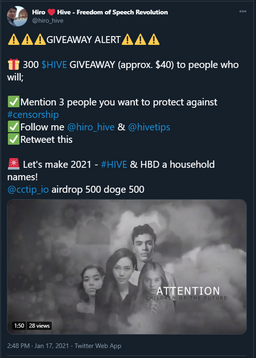 hiro-hive(25)•in #hive-167922•1823 days ago🔴 Let's make HIVE & HBD a household names giveaway for 300 HIVE 🔴Twitter link If you are reading a lot of news lately, you will notice that a lot is going on against Big Tech censorship. We are on the final phase of our Twitt...4hiro-hive(25)•in hive-167922•1823 days ago🔴 Let's make HIVE & HBD a household names giveaway for 300 HIVE 🔴Twitter link If you are reading a lot of news lately, you will notice that a lot is going on against Big Tech censorship. We are on the final phase of our Twitt...4