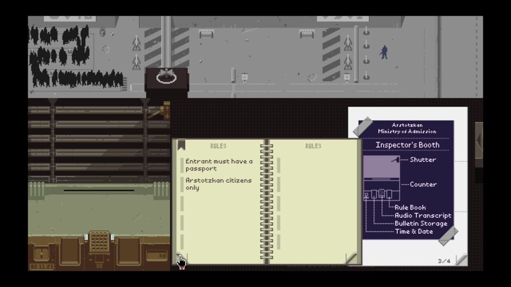 Outside of the puzzles of trying to spot discrepancies on passports, there are also plot lines in the game. You may be offered bribes to let people enter the country, you may be able to find terrorists or criminals and have them arrested, or assist certain political factions. These are often also moral decisions: do you help a stranger and put your own job, and by extension family, at risk?
