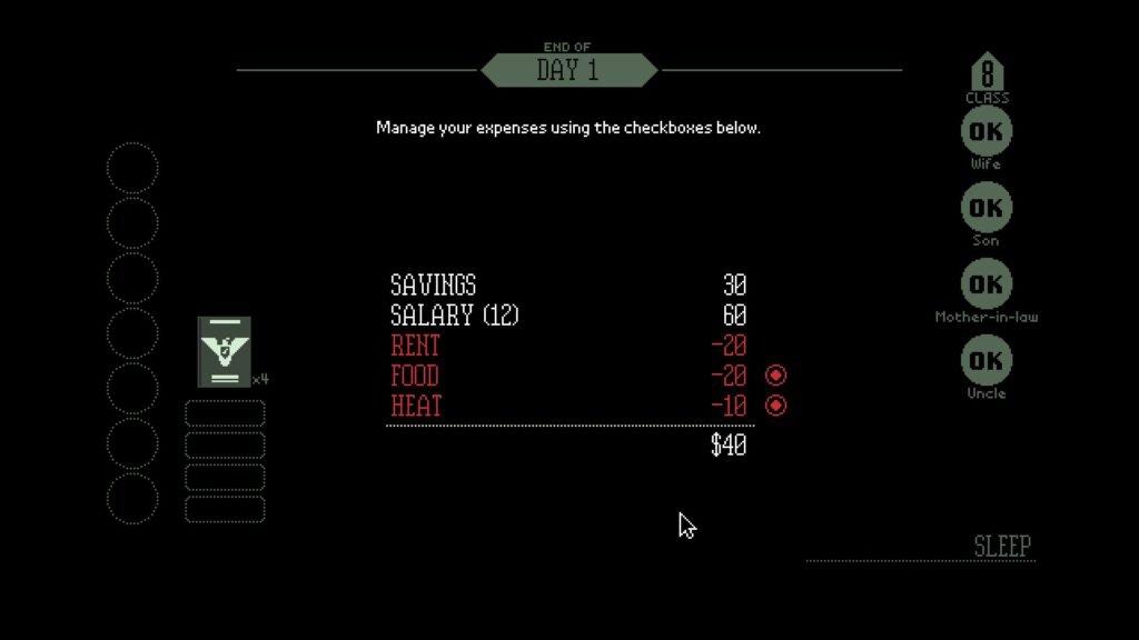 Outside of the booth, you have to deal with paying daily expenses. You always have to pay the rent, but paying for food and heat are optional. Not paying for food or heat can cause the health of your family to deteriorate, leading them to become sick and potentially die. In short, there's a lot of impetus to earn a good wage.