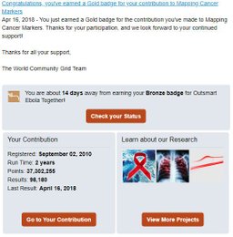 goatman(25)•in #boinc•2828 days agoGold Badge for Mapping Cancer Markers Received (BOINC)After a long time, I finally received another badge for running World Community Grid work units. This time it is gold badge for Mapping Cancer Markers subprojec...9goatman(25)•in boinc•2828 days agoGold Badge for Mapping Cancer Markers Received (BOINC)After a long time, I finally received another badge for running World Community Grid work units. This time it is gold badge for Mapping Cancer Markers subprojec...9