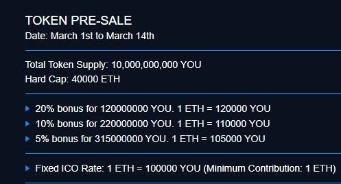 전체 토큰 분배는 100억 YOU입니다. 각 프리세일 단계별로 보너스가 제공되며, 기본적으로는 1ETH=10만YOU입니다. 현재 프리세일 단계는 모두 완료되고, 마지막 단계인 크라우드 세일만이 남은 상태입니다. 이더리움 시세가 폭락하는것에 대응하는것인지 나머지 ICO를 5월로 연기하고 웹사이트 리뉴얼 작업 등을 하는 중인데 기존 투자자들을 많이 배려하는 것으로 보입니다.