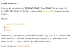 kingscrown(25)•in #bitcoin•2792 days agoZEN to Start Trading on Binance TodayYou can deposit now but trading is not online yet. ZEN is a split chain of ZCL which is a fork of ZEC. Bittrex already got a green candle, since Binance always ...19kingscrown(25)•in bitcoin•2792 days agoZEN to Start Trading on Binance TodayYou can deposit now but trading is not online yet. ZEN is a split chain of ZCL which is a fork of ZEC. Bittrex already got a green candle, since Binance always ...19