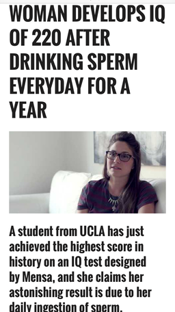 health4life(25)•in #sperm•3012 days agoSperm – To Swallow Or Not To Swallow?This above article recently made the rounds in social media; a young woman developed an IQ of 220 after drinking sperm every day for a year! Yuck! Who woul...35$0.00health4life(25)•in sperm•3012 days agoSperm – To Swallow Or Not To Swallow?This above article recently made the rounds in social media; a young woman developed an IQ of 220 after drinking sperm every day for a year! Yuck! Who woul...35$0.00