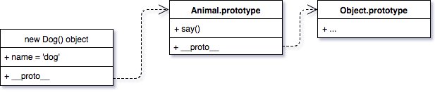 dog.say(); // call Animal.prototype.say with 'dog' context, prints 'This is dog'