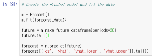 위에 정리해둔 데이터를 Prophet() 생성 후 안에 쏙 넣어주고, 향후 36일을 보고 싶다고 설정해준 뒤 예측 명령을 내리면 되는 것이죠. 코드는 아래와 같습니다.