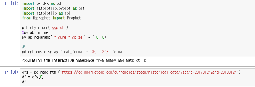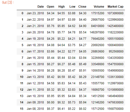 이렇게 pandas로 간단히 코인마켓캡의 스팀 시세 1년치 URL을 넣어주면 아래와 같이 dataframe으로 저장된 것을 확인할 수 있습니다.