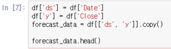 fbprophet은 ds열로 시계열 데이터 &  y열로 예측할 데이터 값을 요구합니다.