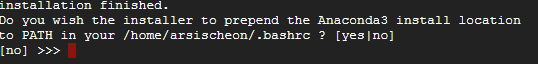 설치가 끝나면 다음과 같은 문구가 뜹니다. Do you with the installer to prepend the Anaconda3 install location to PATH in your ~~~ ? [yes|no]