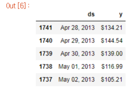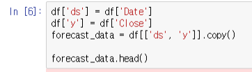 그럼 ds행에 날짜, y행에 종가 저장된 것을 확인할 수 있습니다. 이는 fbprophet에서 요구하는 데이터로, 이 2가지를 이용해 미래 예측을 하게 됩니다.
