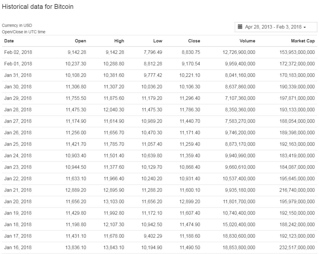 Coinmarketcap - Historical Data for Bitcoin (BTC) https://coinmarketcap.com/currencies/bitcoin/historical-data/?start=20130428&end=20180203