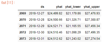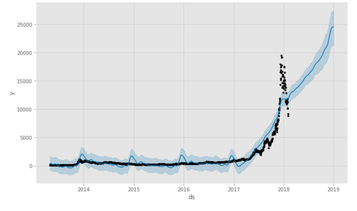 그 결과는 무척 고무적이네요! 2018년 12월 31일 종가는 $24,512.62으로 예측됩니다. 오차범위는 $21,234.02에서 $27,274.54으로 오차 최저가도 이전 역대 최고가를 갱신한 상태네요. 현재가의 약 3배에 이르는 셈입니다.