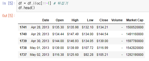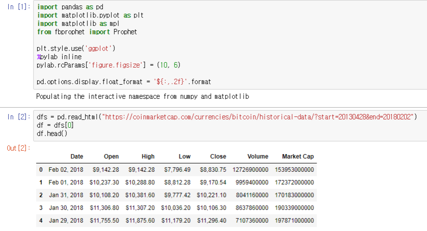 이전 글과 중복되는 내용이니, 코드에 대한 설명은 간단히 넘어가겠습니다. 먼저 약 5년치 데이터를 코인마켓캡에서 가져옵니다.