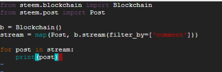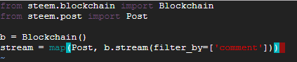 - b.stream(filter_by=['comment'])에서 b. 은 저번에 봤던 형식이죠? b = Blockchain() 즉 블록체인을 b에다 저장했는데 이를 b.stream(~~~)으로 이어붙였네요? 다시 말해 스팀 블록체인은 약 3초마다 하나씩 생겨나는데 이를 스트리밍 해서 읽겠다는 뜻입니다. 즉 생길 때마다 댓글만 필터해서 불러온단 말이죠.