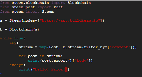 하지만 Hello! Error!가 인쇄된 후에는 프로그램이 종료됩니다. 왜냐하면 try에서 except으로 넘어왔는데 여기는 계속 스팀 블록체인 정보를 받아오는 기존의 코드가 없잖아요?