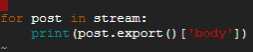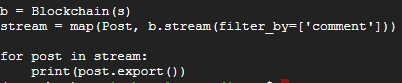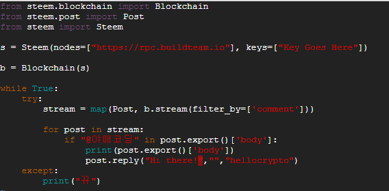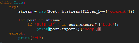 이전에는 단순히 print(post.export()['body'])로 스팀 블록체인에서 받아오는 모든 글을 인쇄했지만, 이제는 if를 이용해 "@야매코딩" 문구가 있어야만 인쇄되게끔 if "@야매코딩" in post.export()['body']:이 추가됐죠?
