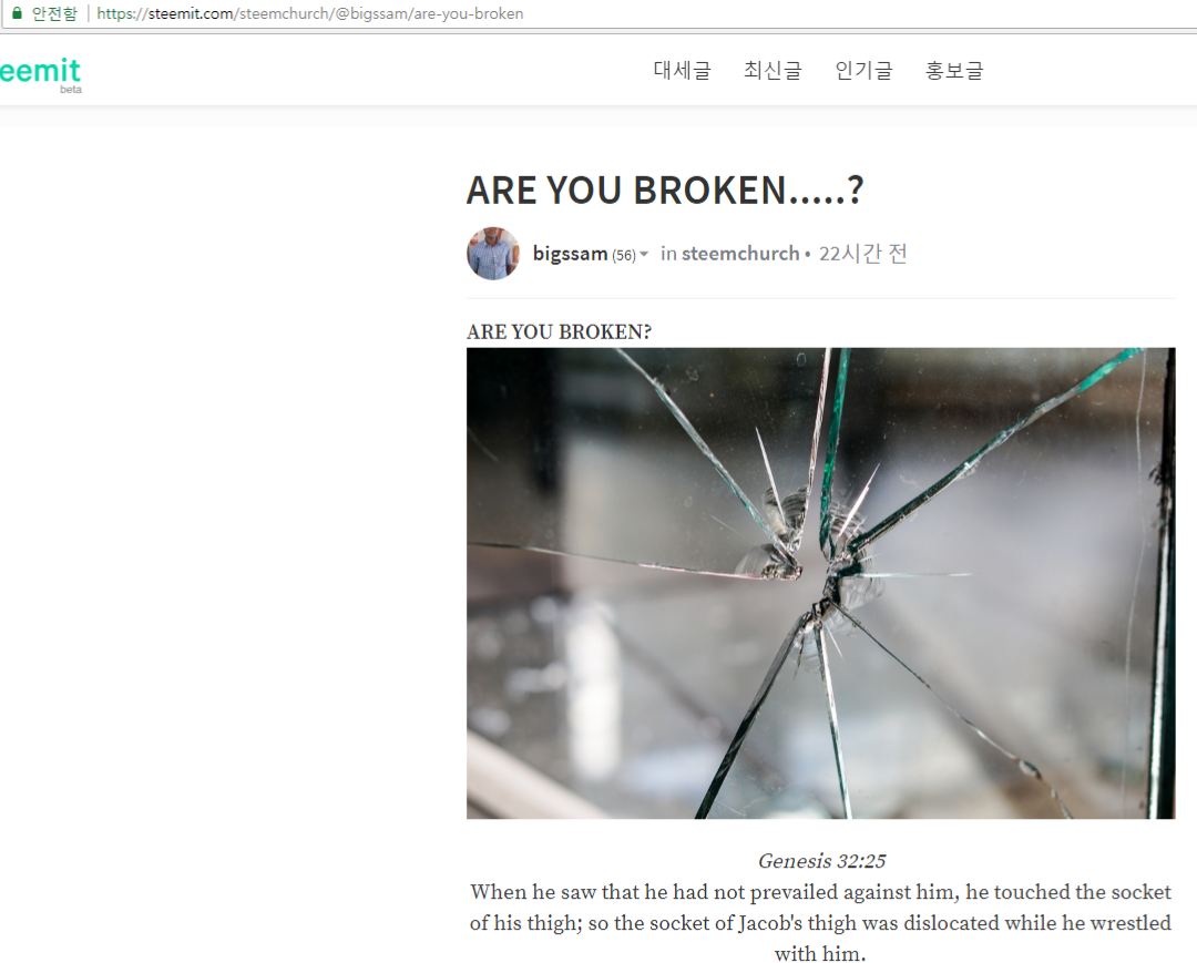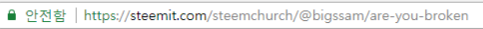 인터넷 브라우저 URL에 steemit.com/@bigssam/are-you-broken를 입력했더니, 자동으로 맨 앞에 steemchurch라는 변경불가의 첫 태그가 자동으로 붙어 최종적으로 steemit.com/steemchurch/@bigssam/are-you-broken라는 포스트가 보이게 되었습니다.