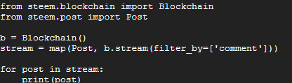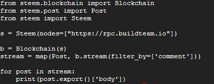 그리고 바로 아래에 s = Steem(nodes=["https://rpc.buildteam.io"])를 입력해주세요. https://rpc.buildteam.io라는 노드를 사용하게 되는겁니다. 스팀API 첫 예제에서는 s = Steem()뿐이었는데 안에 노드 정보가 추가된거죠 이번에는.