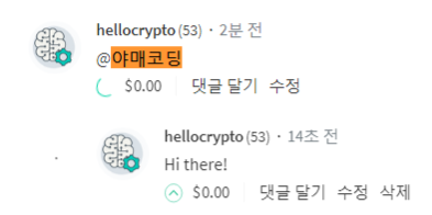 실시간으로 불러오고 있는 post 중에서 "@야매코딩"이 있다면, .reply() 답변을 답니다. 그 내용은 ("Hi there!","","hellocrypto")인데요, "Hi there!" 대신 다른 문구를 넣어도 당연히 됩니다. 그리고 끝에 "hellocrypto"는 작성자 ID입니다. 이를 본인 ID로 바꿔주세요 :)