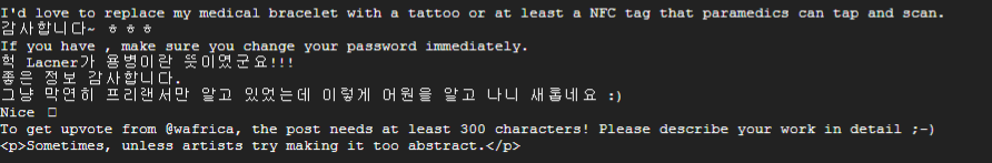좋아요. 이제 프린이 여러분은 스팀 블록체인에서 실시간으로 생겨나는 게시물/댓글의 permlink를 얻어오는 능력을 갖췄어요.