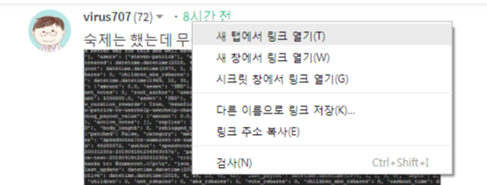 그럼 포스트만 그러냐, 하면 아닙니다! 댓글도 마찬가지로 고유주소가 있습니다. 구조는 비슷하나 길이는 훨씬 깁니다. 댓글 시간 표시에 우측 클릭해서 링크를 확인할 수 있습니다.