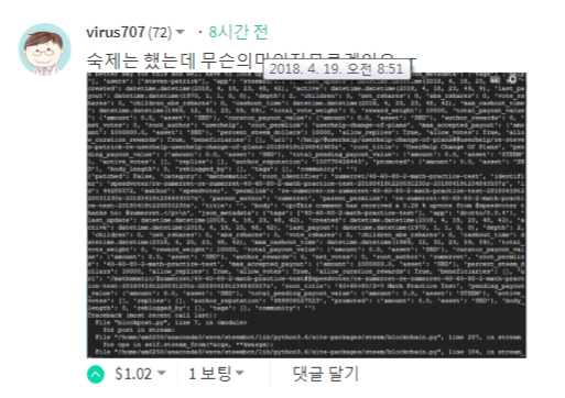 또한 스팀 API 심화 단계로 블록체인이랑 포스트 개념도 소개되었습니다. 일단 따라는 하면 뭔가 막 실시간으로 스팀 블록체인에서 받아와졌죠.