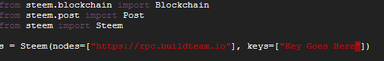 s = Steem(nodes=["https://rpc.buildteam.io"], keys=["Key Goes Here"])