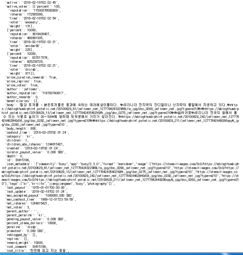 그럼 아래와 같이 글 하나당 수 많은 정보를 담은 결과가 돌아옵니다.