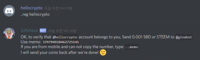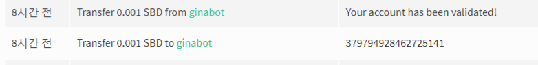 마지막 절차로 @ginabot이 본인확인 절차로 딱 최소금액인 0.001 SBD를 보내면서 메모에 고유번호를 입력하러 해서 따라 송금해줬습니다.