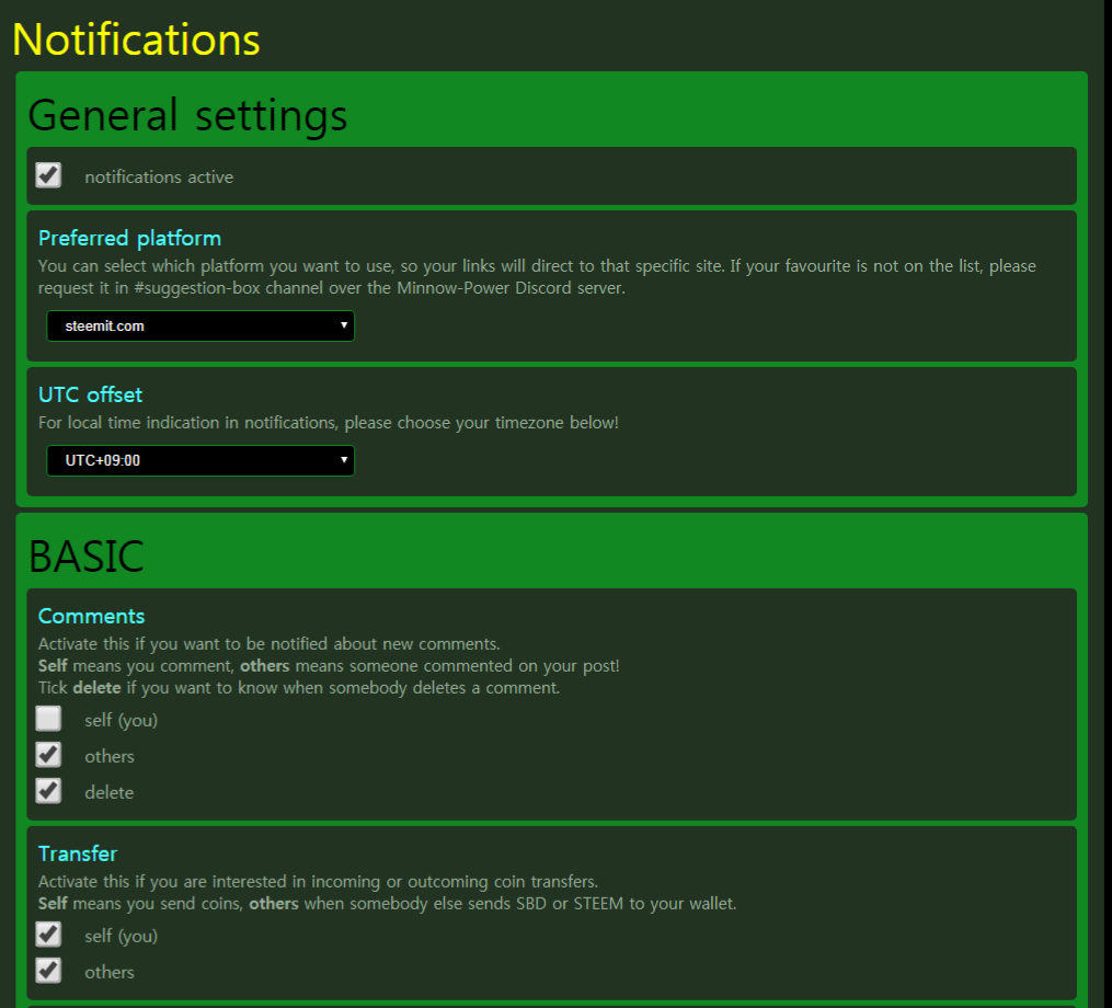 예를 들어, 링크 URL에서 기본 플랫폼을 steemit.com으로 할지 아님 busy.org 같이 다른 3자 플랫폼으로 할지 부터 시간대, 댓글, 송금, 스파임대, 큐레이션/작가 보상, 멘션, 리스팀, 팔로우, 업보트/다운보트, 지정한 유저의 신규 포스팅, 특정 단어 알림 설정 등이 풍부하게 있습니다.