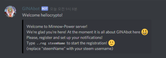 좌측에 보시면 여러 단톡방들이 보일텐데요, 그중에 #registration으로 가서 본인인증을 해야 합니다. 지나봇이 반갑게 닉네임을 불러주면서 맞이해줄겁니다 :)