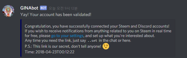 그럼 지나봇이 Discord에서 인증 성공했다고 개인톡과 링크를 보냅니다.
