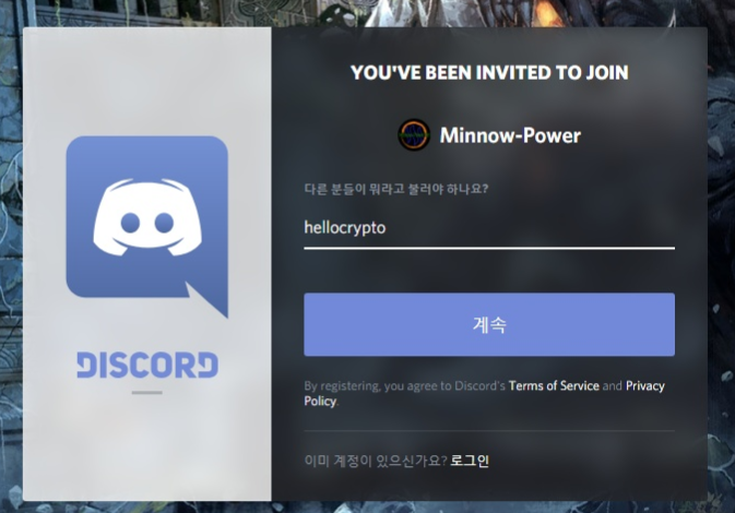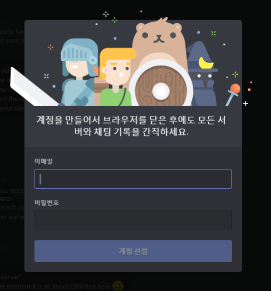 Discord 사용이 처음이시라면 닉네임을 정하시면 되고, 이전에 써봤다면 당연히 로그인을 하면 되겠죠?