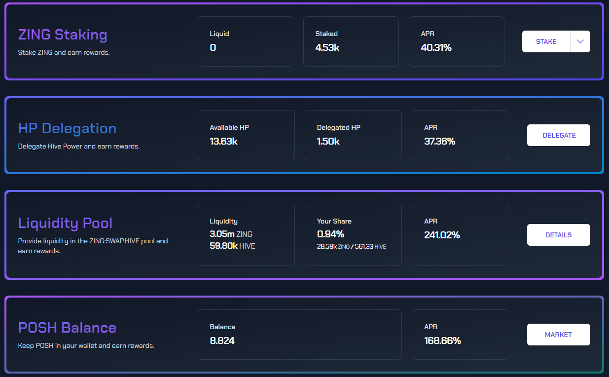 So why are people delegating to this account? Thanks to these delegations, you can earn ZING tokens, the game’s token, and currently the APR on delegation is much higher than staking Hive Power. You can see today’s APR in the screenshot below. The token can be earned not only by delegating HP, but also by holding POSH tokens, staking ZING tokens and providing liquidity to the liquidity pool. If you want to read about the economics of the token, you can follow @libertycrypto27. He occasionally shares very informative and detailed posts on this subject.