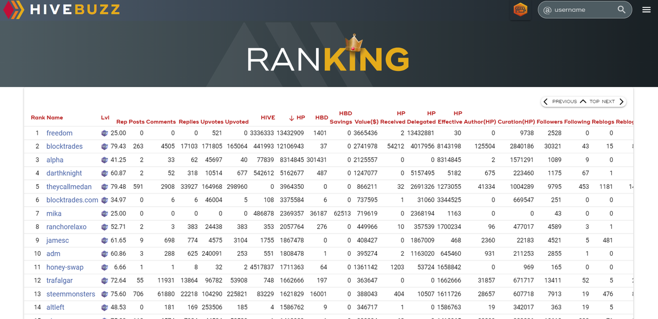 Another cool part of the website is the Ranking section, which can be accessed by clicking on the crown sign at the top right. Here you can see the rankings for the users with the highest reputations, the users with the most shares, the users with the most comments, the users with the most Hive Power and much more detailed data. (Editor's note: it's fun to check your own rankings! You should do it from time to time. LOOL)