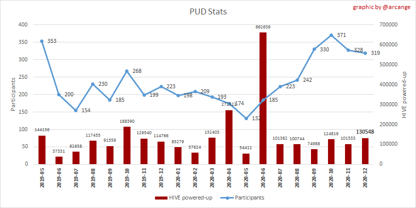 On the other hand, we see a glaring increase in the volume of Hive which was powered-up, with a new record since HiveBuzz supported the project. No less than 130548 HIVEs have been staked. Congratulations to everybody.