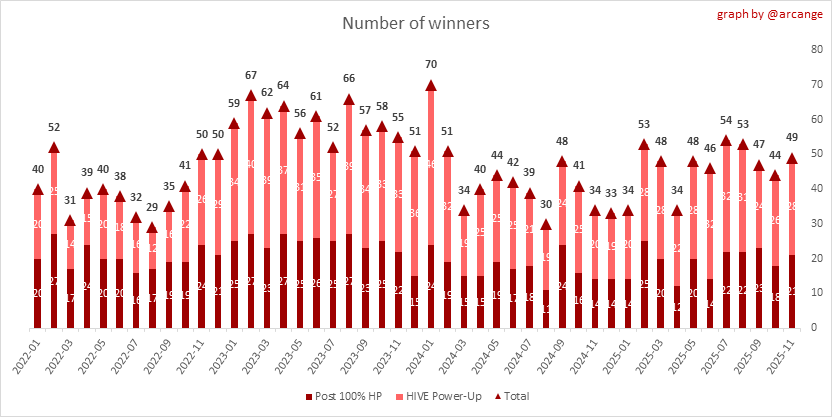 Among the 49 participants to have held on without failing, we have 21 users who chose the publication with a 100% HP payout option, and 28 users who preferred the power-up way.