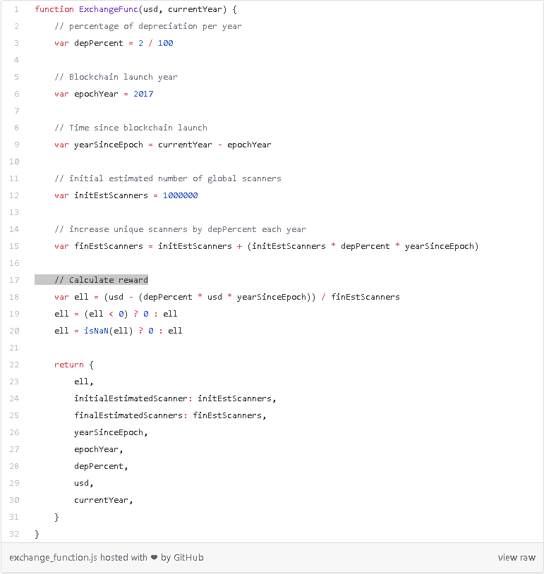 交換アルゴリズムによって、特定の紙幣をどれだけの量のコインと交換するかが決定されます。このアルゴリズムは、紙幣の額面を入力として受け入れ、Ellの数を戻り値として返します。また、このアルゴリズムでは難易度特性(Difficulty feature)が採用されており、これにより報酬額は毎年2%ずつ削減されていくことになります。リリース初期には、100万のスキャナーが検査ルーチンに参加すると見積もられており、紙幣の額面はその推定スキャナー数で分割されることになります。これには、現在の供給量を過度に膨らませることなく、数百万もの人々が検査に参加できるようにするという効果があります。初年度に1 Ellを得るには、およそ1,000,000ドルほどかかることになります。スキャナーの数は、毎年2%ずつ増加していくと見積もられています。JavaScriptによる実装は、以下のコードで確認することができます。