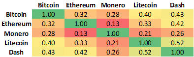 私の元々の関心は、アセット間の相関関係にありました。多様化で大きなメリットを享受するためには、アセットに正の低い相関または負の相関がなければなりません。暗号通貨間に強い相関があった場合、マーコウィッツの最適化モデルは暗号通貨だけで構成されるポートフォリオには実用的ではないということになります。しかし、今回はそのようなケースではありませんでした。実際、下の表で示すように、相関の多くは0.5を下回っていました。