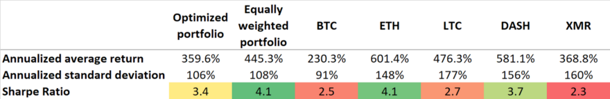 この結果から分かるように、最適化されたポートフォリオは素晴らしい結果を示しました。106%の標準偏差で359.6%もの年換算利回りを達成しており、シャープ・レシオの値は3.4となっています。このシャープ・レシオは非常に高い値であり、主要な資産区分(債券や株式など)への投資では通常このような値を得ることは困難であると考えられています。しかし、他のポートフォリオなどと比較した場合、最適化されたポートフォリオは最高のパフォーマンスを示すストラテジーではありませんでした。今回の結果では、等金額ポートフォリオが最も優れたパフォーマンスを示すということが分かりました。
