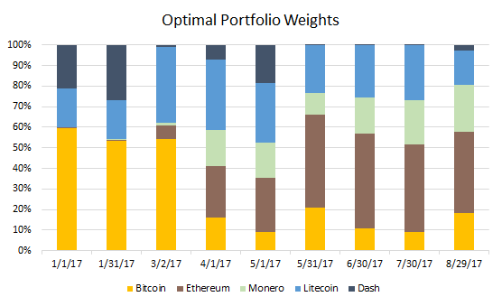この実験では、1トークン当たり1ドル以上の価格を持ち、2016年1月1日以前の取引履歴を利用することが可能な暗号通貨を使用することにしました。そしてそのような暗号通貨の中から、時価総額の高い5つの暗号通貨を使用することにしました。その5つの暗号通貨とは、ビットコイン、イーサリアム、ライトコイン、ダッシュ、モネロです。データとして過去180日間という枠組みの価格データを使用し、30日毎の調整期間を設定しました。つまり、アルゴリズムの実行開始時とその後の30日毎に、モデルは過去180日間のリターンに関するデータを使用し、効率化フロンティアの計算を行います。最終的に、調整期間毎にシャープ・レシオが最大となるポートフォリオの重みを得るようにモデルをプログラミングしました。このモデルのPythonコードはGitHub上で確認することができます。