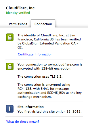Chrome에서는 주소 표시 줄의 잠금을 클릭하고 연결 탭으로 이동하여 보안 연결을 설정하는데 사용된 암호화 알고리즘을 확인할 수 있습니다. Chrome 30에서 자물쇠를 클릭하면 다음 이미지가 보입니다.