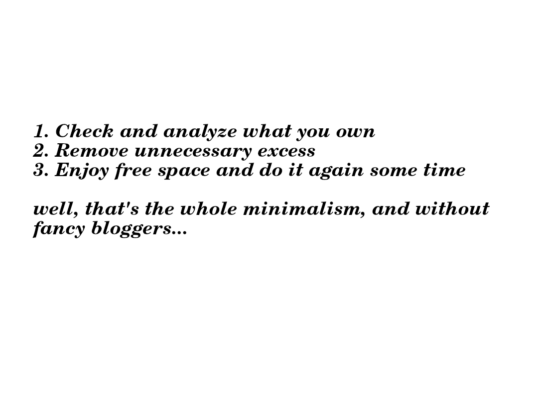 I love minimalism. Both visual one, the minimalism of the form, minimalism in the art and the lifestyle minimalism - the one that is about having less, putting experiences and other values over physical items. Ever since I remember I wasn't able to stick to minimalism in my writing, often I create long sentences so my writing is not minimalist :) And that's fine, I think that there is nothing wrong with not being 100% minimalist, because it's not possible and because being a minimalist is not like being in some kind of cult. It is about living by general ideas that everyone can tailor to himself. Despite that, some internet communities related to minimalism have among them people who seem to think that it is a cult and a set of rigid rules. There are bloggers who count how many items they own, they participate in challenges like "try to live with less than 100 items", there are people that ask their guru if they should or should not get rid of certain item and finally there are critics, that claim that minimalism is terrifying because they could not live in an empty room with just a mattress and empty bed, without even a proper space to put books on.