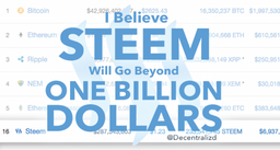 decentralizd(25)•in #steemit•3155 days agoWhy I believe Steem is going to a 1 Billion Dollar Market Cap within 2-3 months, with evidence.1. Steem is severely undervalued, let me explain why. There are many logical reasons Steem is undervalued but lets just explore some of the major ones. First, S...134decentralizd(25)•in steemit•3155 days agoWhy I believe Steem is going to a 1 Billion Dollar Market Cap within 2-3 months, with evidence.1. Steem is severely undervalued, let me explain why. There are many logical reasons Steem is undervalued but lets just explore some of the major ones. First, S...134