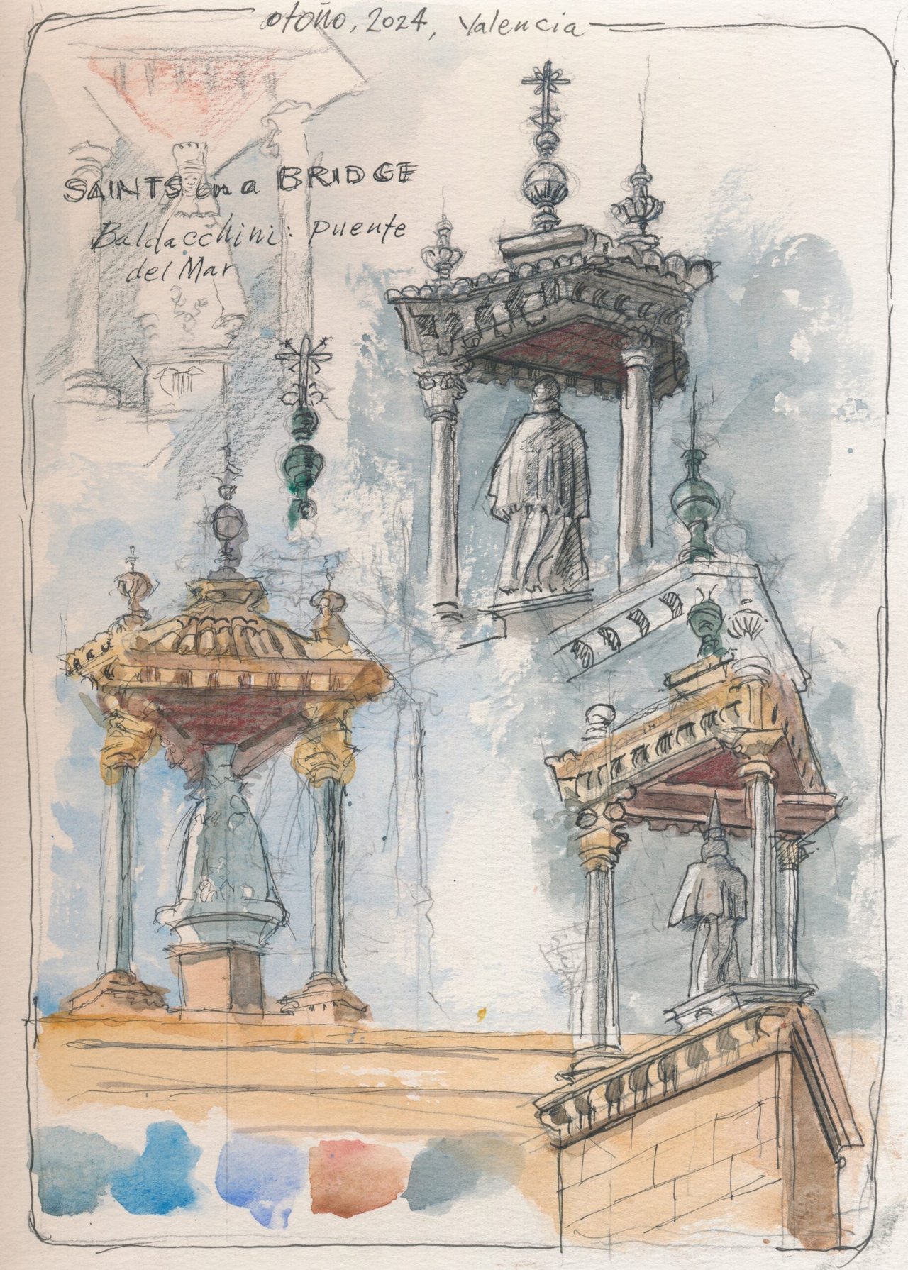 I loved to draw the statues under their protective canopies, their baldacchini. I had little interest in the identity of the saints themselves, more interest in what roles they play. What do they symbolize? Bridges cross voids; ideally they create connections, trade and other peaceful relationships between people and places that are separated. The statues offer their blessings and protection to everyone who travels across to the other side.