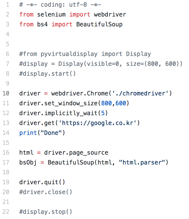 다시 소스로 돌아가면, 주석처리된 6, 7, 8, 22 번째 줄은 크롬을 직접 띄우지 않고 가상의 화면으로 돌릴 때 사용하는 코드이다. 이를 'Headless Chrome with Selenium' 이라고 표현한다. 혹은 크롬드라이버를 띄울 때 --headless 옵션을 주는 방법이 있다. 이것은 두번째 소스에 포함되어 있다.