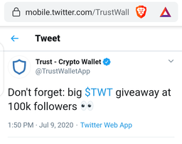 kingsjoe247(25)•in #esteem•2022 days agoTrust wallet giveawayTrust wallet is doing a giveaway at 100k followers on Twitter. It's going to be a massive giveaway. It's 99,300 followers already. Don't miss this opportunity. ...20$0.00kingsjoe247(25)•in esteem•2022 days agoTrust wallet giveawayTrust wallet is doing a giveaway at 100k followers on Twitter. It's going to be a massive giveaway. It's 99,300 followers already. Don't miss this opportunity. ...20$0.00