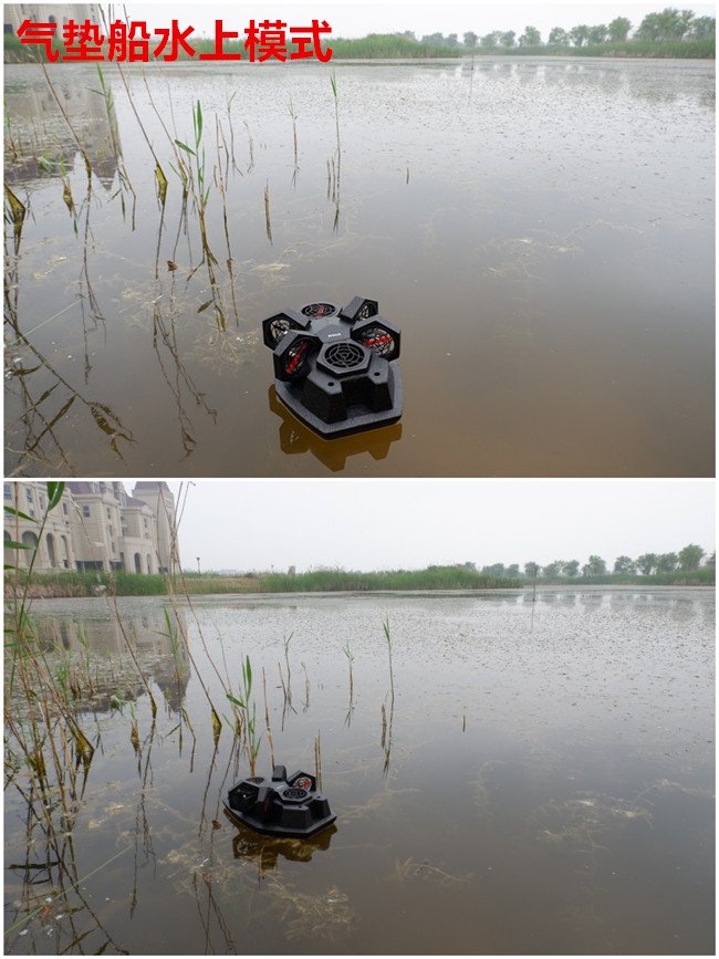 APP連接成功後打開氣墊船控制介面選擇水上模式,氣墊船放在水裏後就變成了一個小快艇,因為它的主體材質是EPP所以它會漂浮在水面上,不用擔心水會進入控制模塊,但是值得提醒的是在室外玩的時候一定要選擇風平浪靜的時候。第一次拿到室外去的時候,因為有點風,放在河面的時候差點被風吹出控制範圍。
